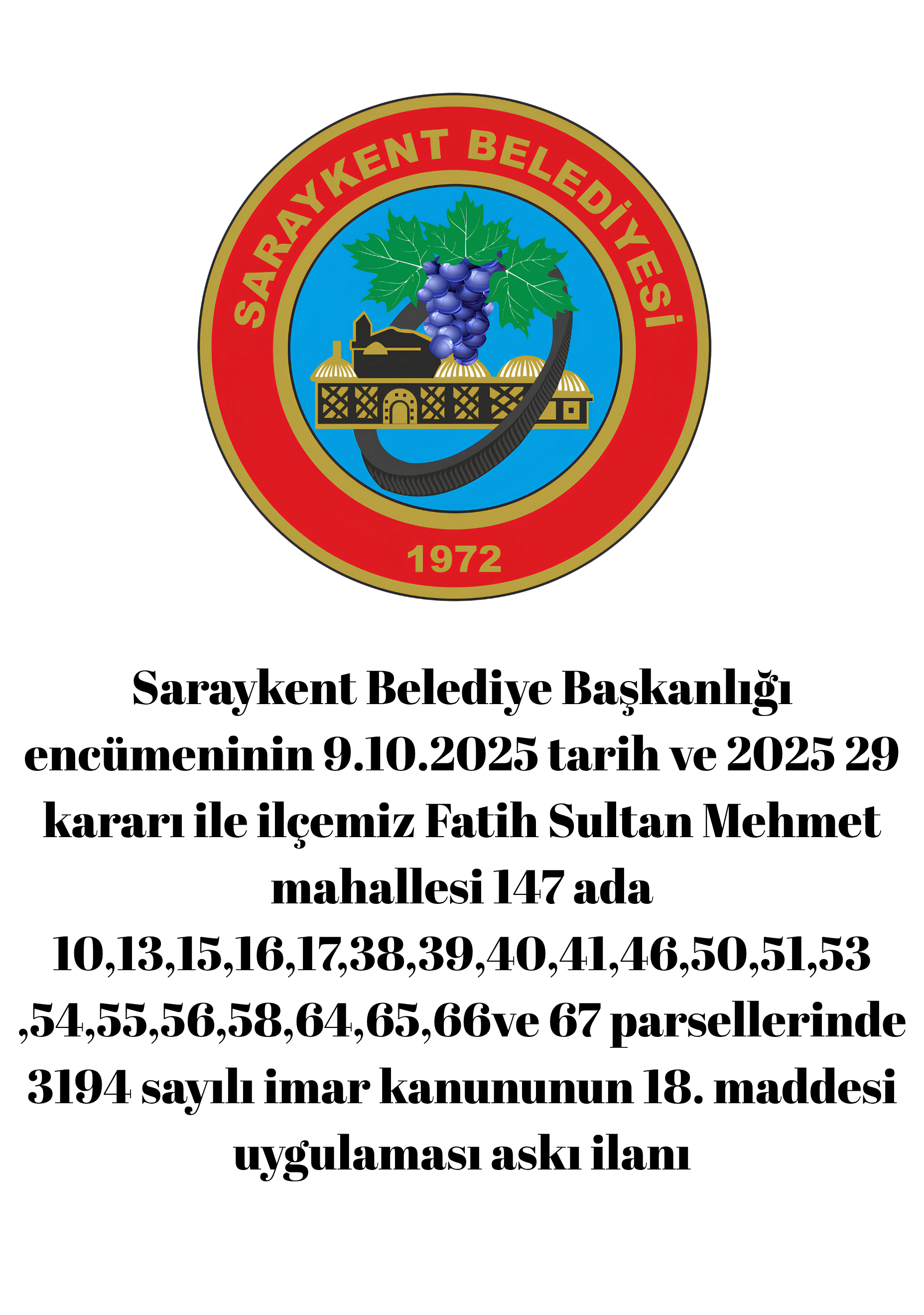 - Saraykent Belediye Başkanlığı encümeninin 9.10.2025 tarih ve 2025 29 kararı ile ilçemiz Fatih Sultan Mehmet mahallesi 147 ada 10,13,15,16,17,38,39,40,41,46,50,51,53 ,54,55,56,58,64,65,66ve 67 parsellerinde 3194 sayılı imar kanununun 18. maddesi uygulaması